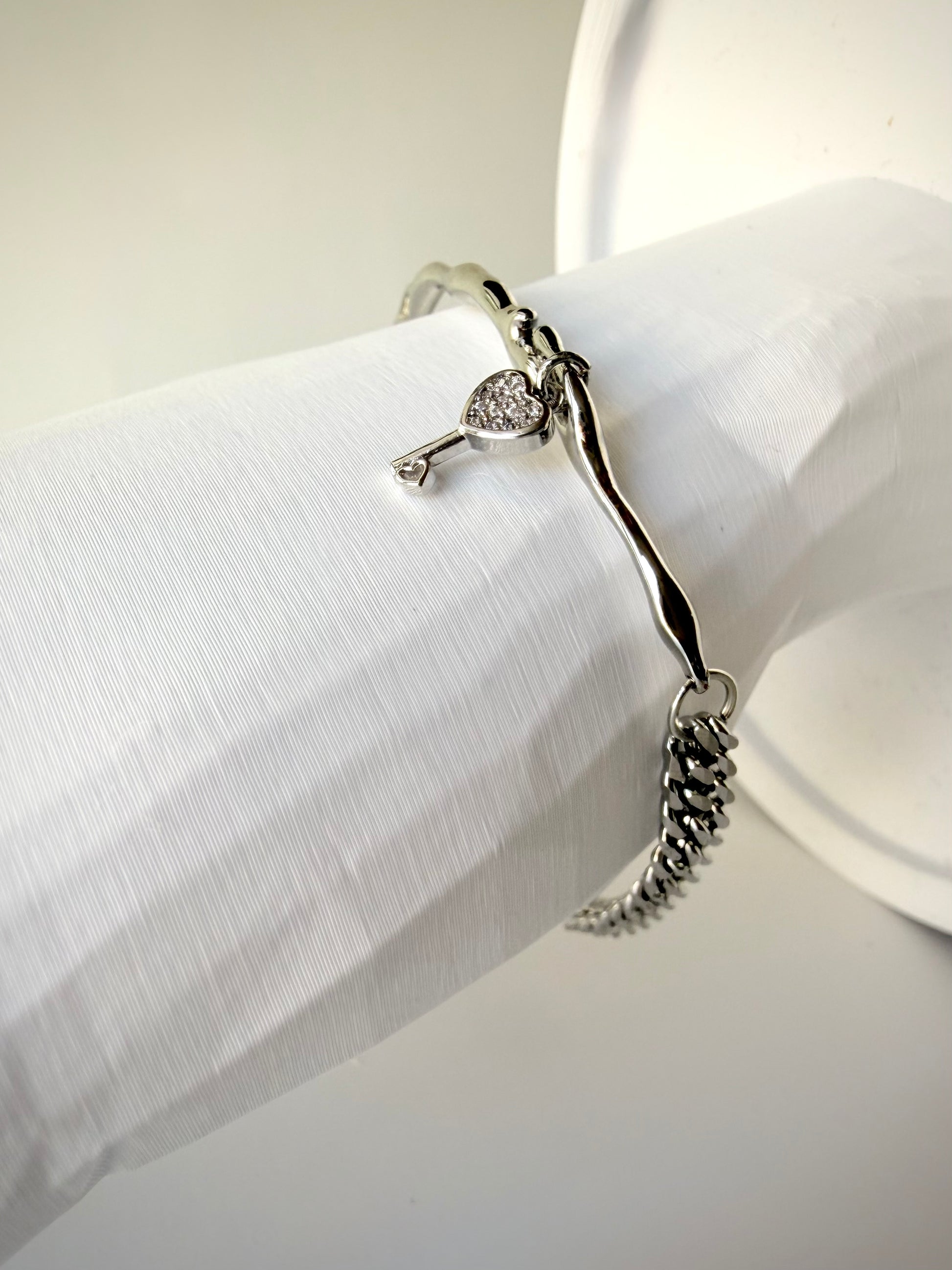 Design: Delicate curb chain bracelet featuring a molten curved connector and micro pavé key charm, combining fluid form with subtle symbolic detail
