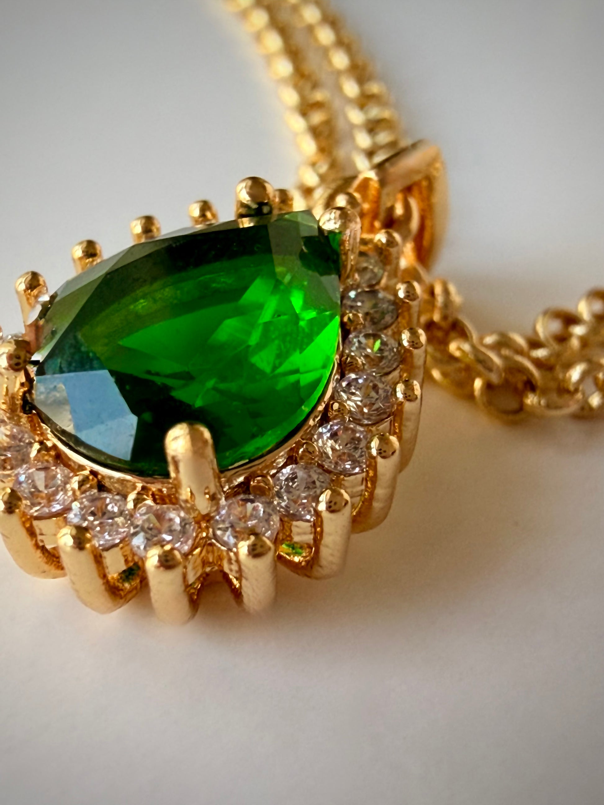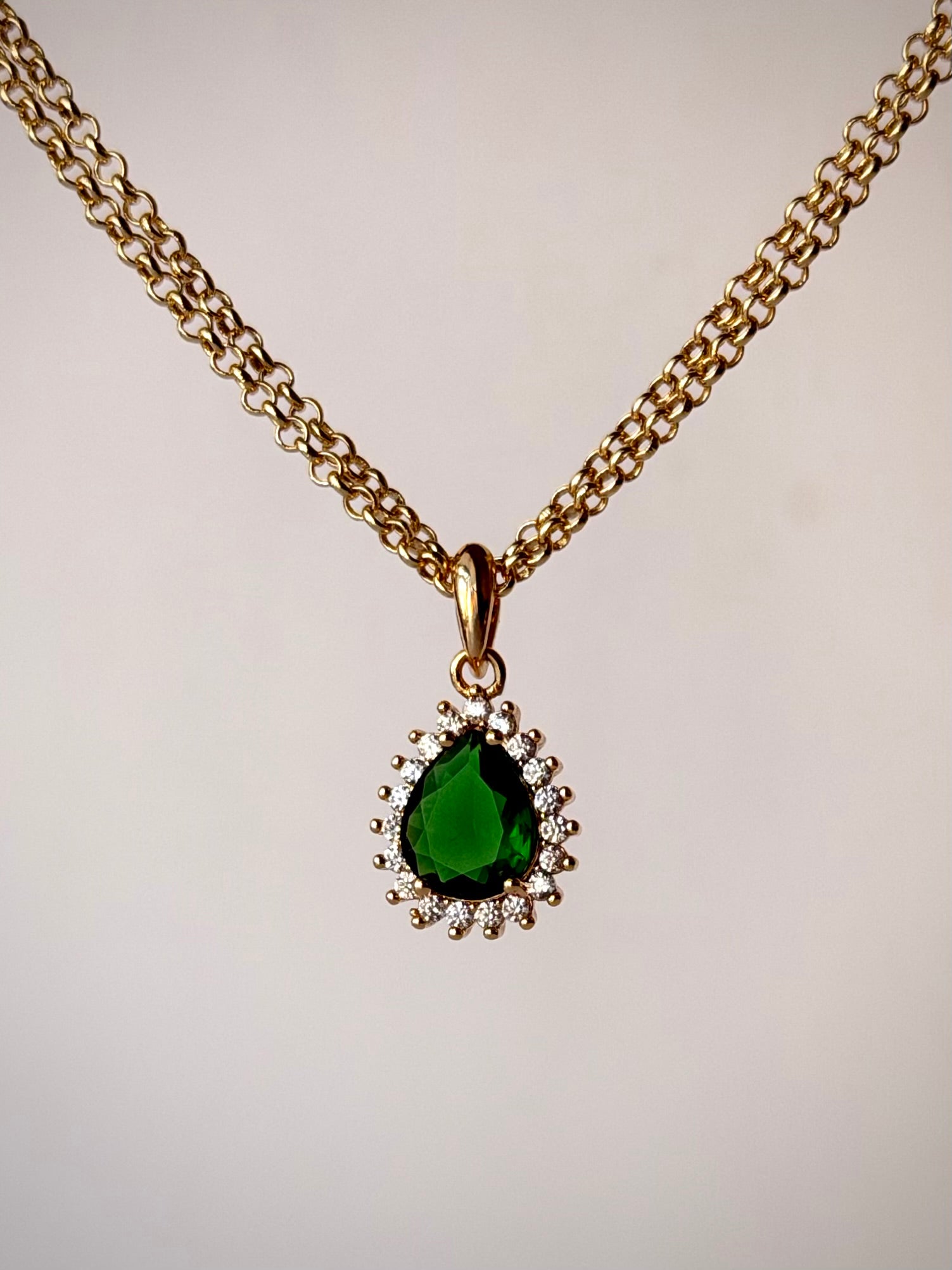 Material: 24k Gold-Filled Double Rolo Chain + 24k Gold-Filled Emerald-Toned Teardrop CZ with Clear CZ Halo Pendant